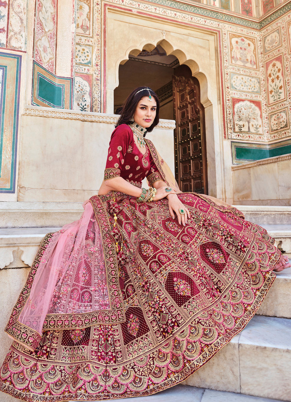 Fabric Details: The lehenga is expertly crafted from heavy velvet, exuding opulence and grandeur. It boasts intricate dori work and zarkan work, adding a touch of glamour to this ethnic masterpiece. The lehenga comes in a versatile size range, accommodating up to 42 inches, ensuring a comfortable and flattering fit for brides of varying body types.