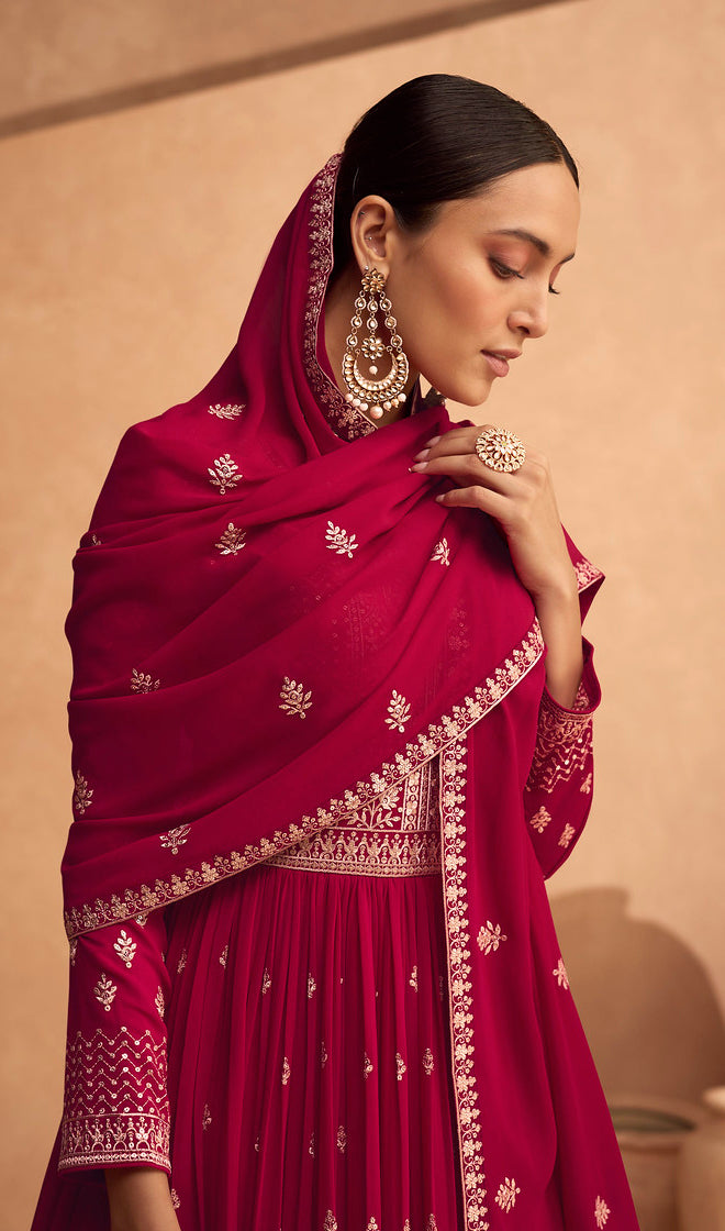 Embark on a journey of style and grace by browsing our online collection and acquiring this Indian Anarkali dress today. Whether it's a wedding, a festive celebration, or a special event, this dress is guaranteed to make you the center of attention. Elevate your fashion quotient with Ethnic Gallery's red georgette designer Anarkali dress, embracing the essence of timeless elegance with a contemporary touch.