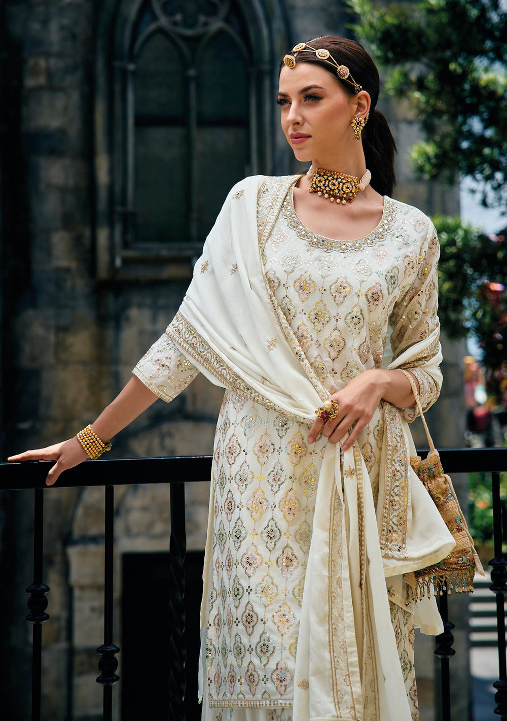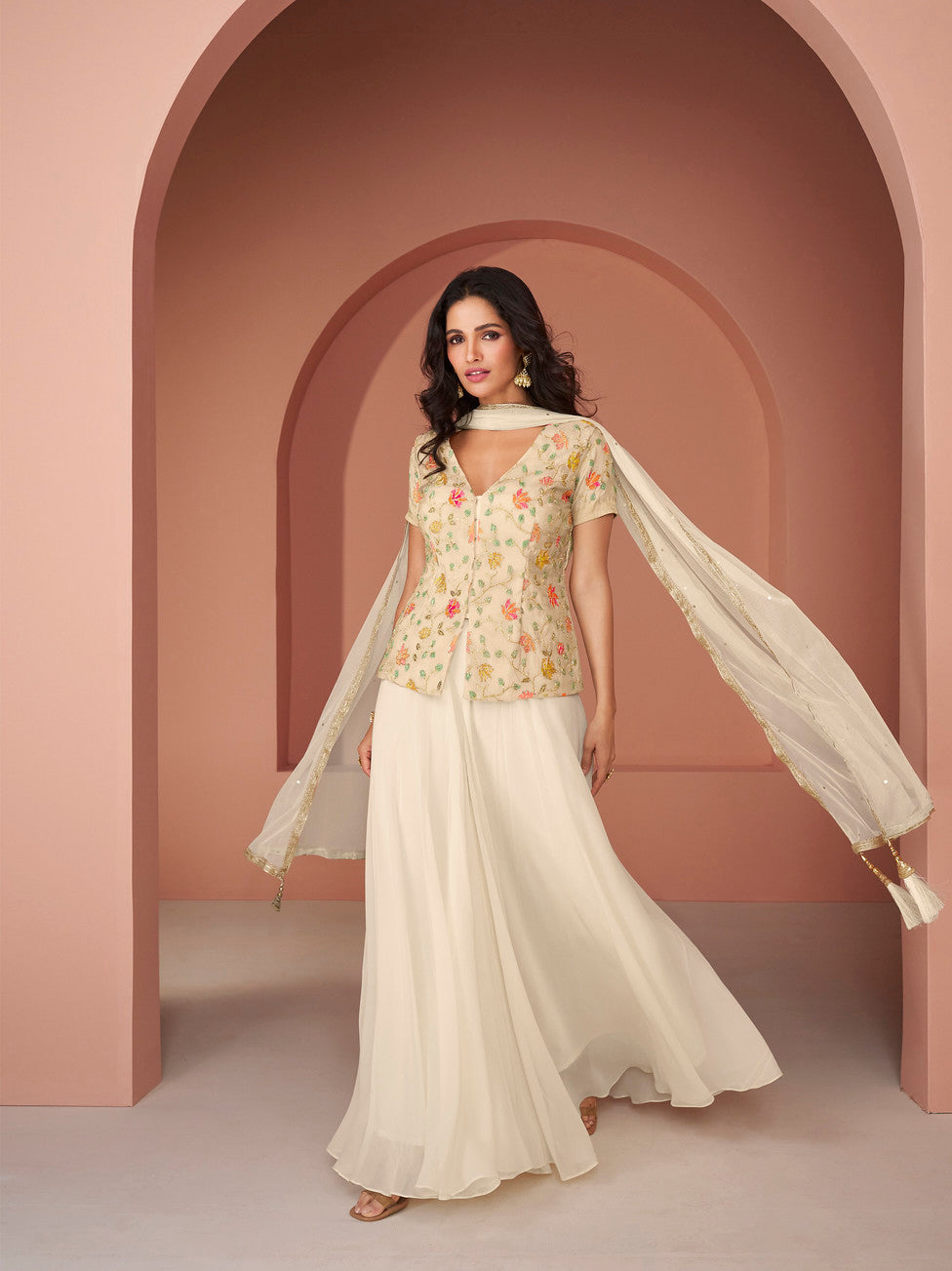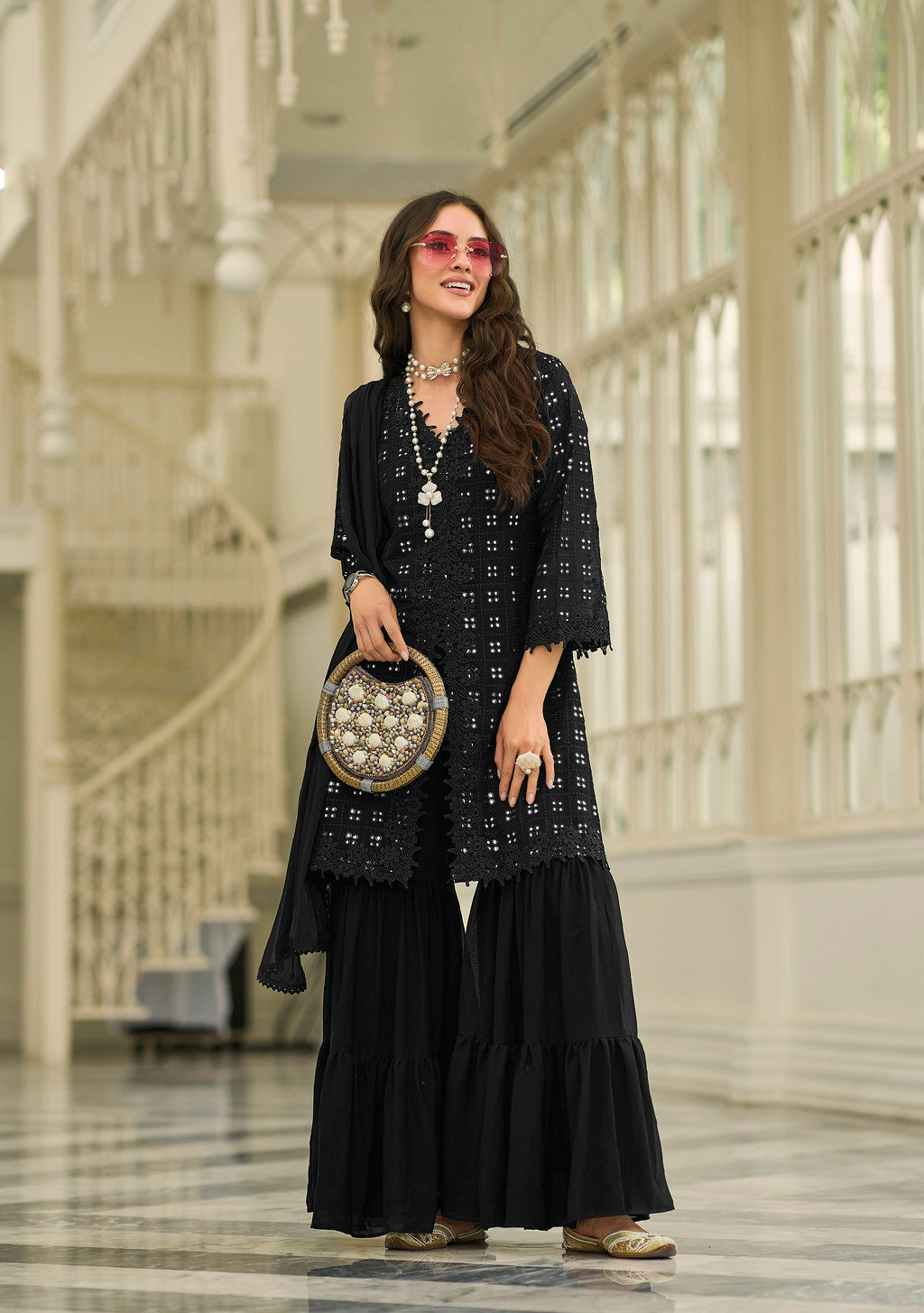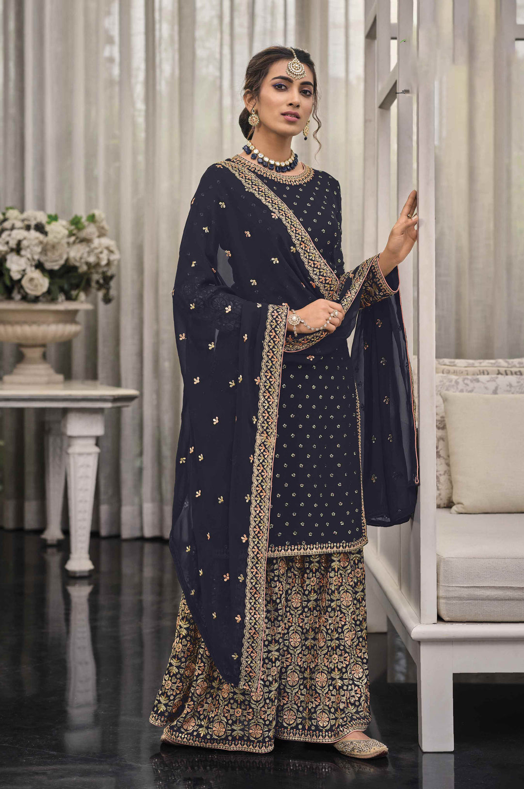 Discover the timeless elegance of Sharara Suits at Ethnic Gallery, an ensemble that traces its roots back to the Mughal era and has since become a cherished part of Indian fashion. The Sharara suit comprises a set of kameez, dupatta, and bottom. What sets it apart is the unique design of the bottom, which is fitted from the thigh area and gracefully flares out towards the bottom. This Ethnic wear has a rich history and is particularly adored during Eid celebrations by women. Modern women are drawn to the charm of Sharara suits, as they add a youthful and refreshing touch to their appearance. These suits strike the perfect balance between a fitted and flared silhouette, making them ideal for special occasions and festivals. Sharara suits are a fantastic alternative to lehengas, offering ease of movement and comfort. They are particularly popular choices for weddings, haldi ceremonies, and mehndi celebrations. What's more, you can experiment with different dupatta draping styles to create a unique look that suits your personal style. Elevate your fashion game with the grace and charm of Sharara Suits from Ethnic Gallery, and make a lasting impression at every special occasion. Shop online for your favorite Sharara Suit design and redefine your ethnic wardrobe with ease.