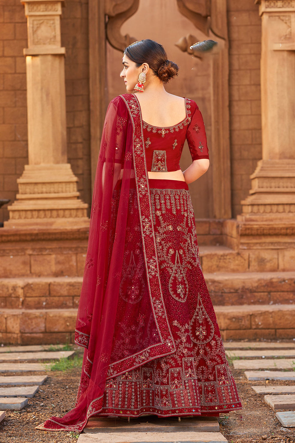 Our Designer Lehenga Choli in Red embodies timeless charm, suitable for weddings, receptions, and festive celebrations. The soft net fabric drapes gracefully, creating a flattering silhouette that complements all body types. The exquisite zari embroidery and mirror work add a touch of opulence and traditional allure to the ensemble, making it a head-turner.