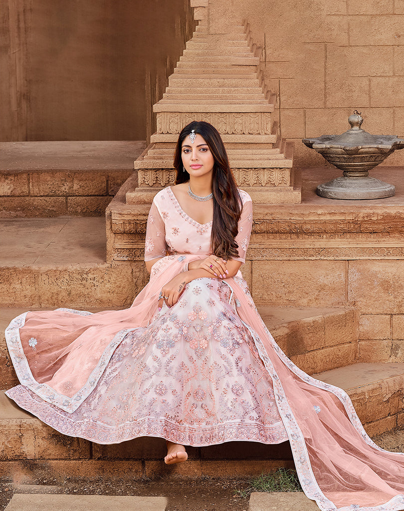 Fabric Details: Our Light Pink Lehenga Choli is meticulously crafted from the finest quality soft net fabric, ensuring an ethereal drape and comfortable fit. The exquisite zari embroidery and mirror work, gracing both the lehenga and blouse, exude an aura of opulence and grandeur. To enhance comfort, the lehenga comes with a crape inner lining. The accompanying dupatta, made from soft net, mirrors the same stunning embroidery and mirror work. It is provided unstitched, allowing you to personalize it to your desired style.
