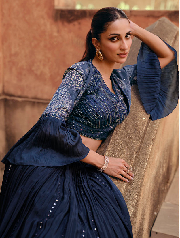 When a garment is labeled as semi-stitched, it means that the main body or structure of the outfit, such as the blouse or the lehenga skirt, is partially stitched and has some pre-defined measurements. However, the fitting and customization of specific areas, such as the blouse's neckline, sleeves, or the lehenga's waist, are left unfinished. This allows the wearer to have more flexibility in adjusting the fit and style according to their preferences.